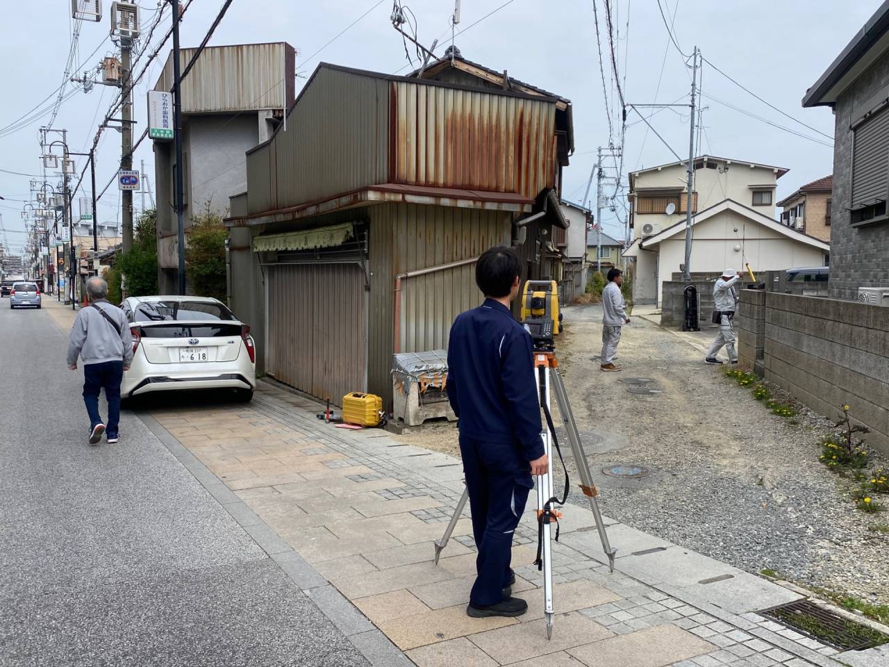 現況測量→隣地の所有者の方との立会→現地ポイント→筆界確認→地積更生となります。